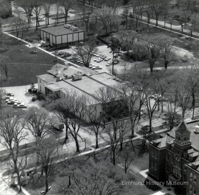 Aerial view of the Elmhurst Public Library in the Wilder Mansion, including the recently constructed addition on the west side of the building, looking southeastPhotograph Details