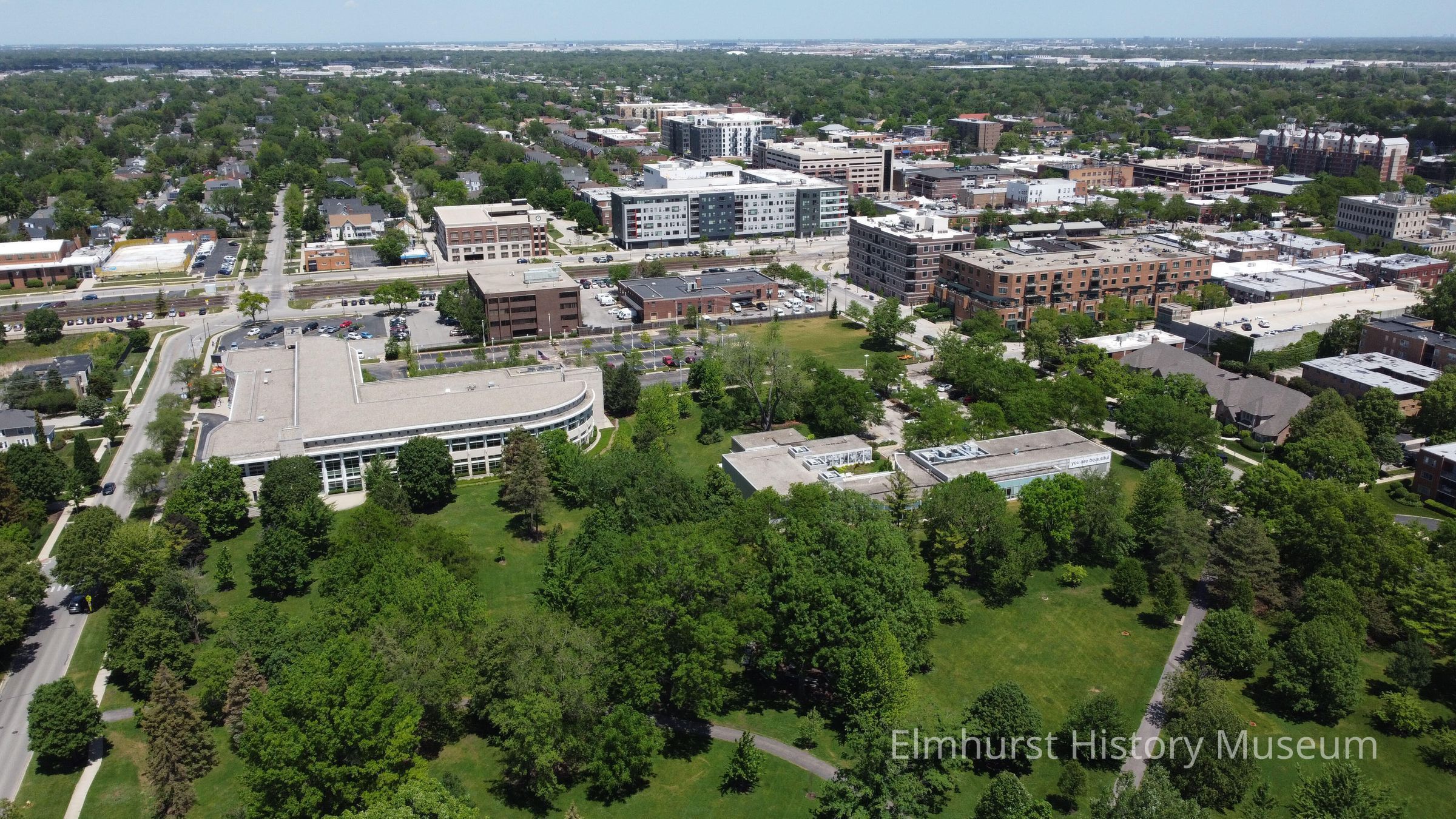 Aerial view of north end of Wilder Park, viewing the Elmhurst Public Library and the Elmhurst Art Museum.Photograph Details
