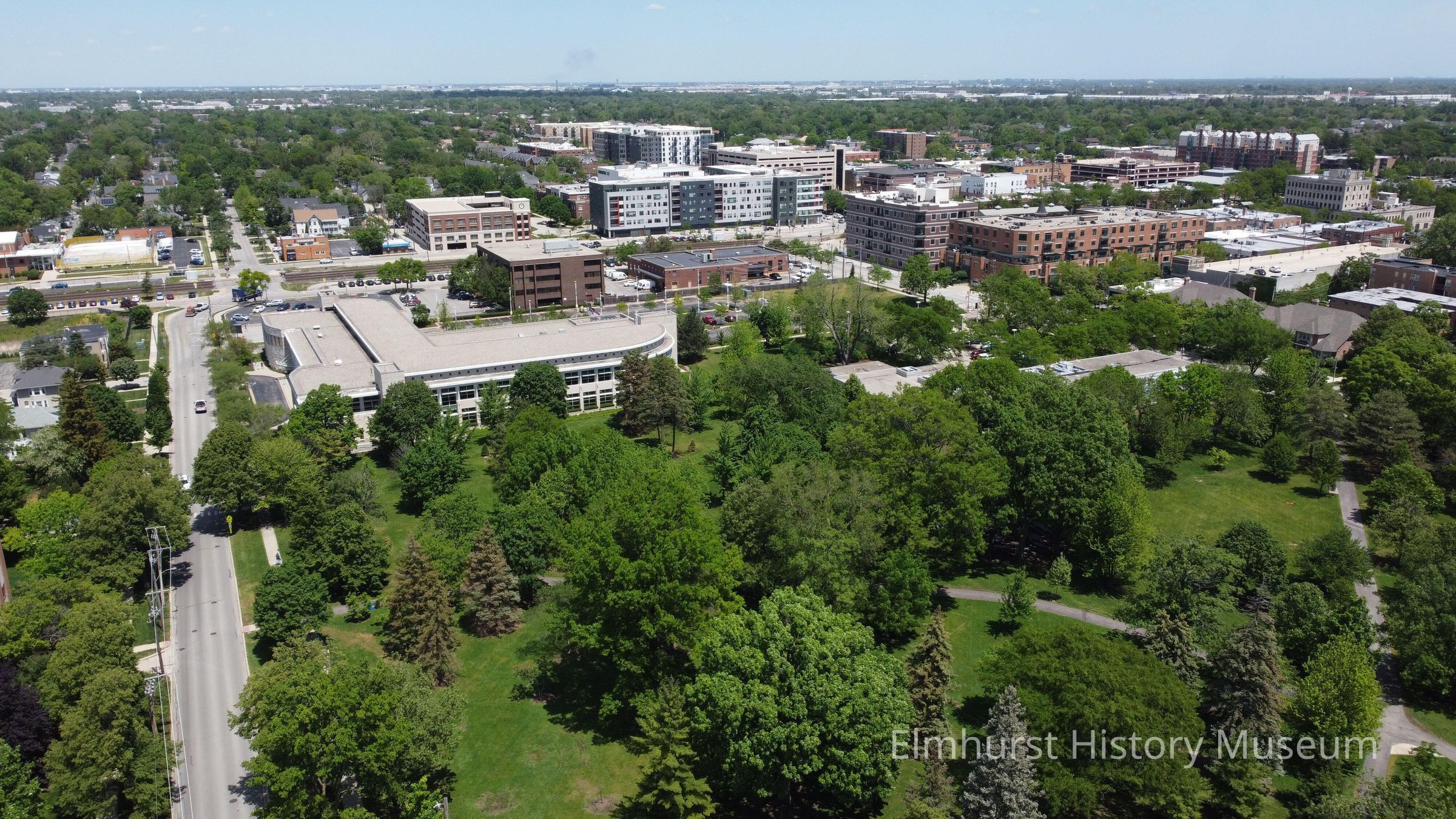 Aerial view of of south edge of Wilder Park, looking north alone Prospect Ave. Elmhurst Public Library is pictured.Photograph Details