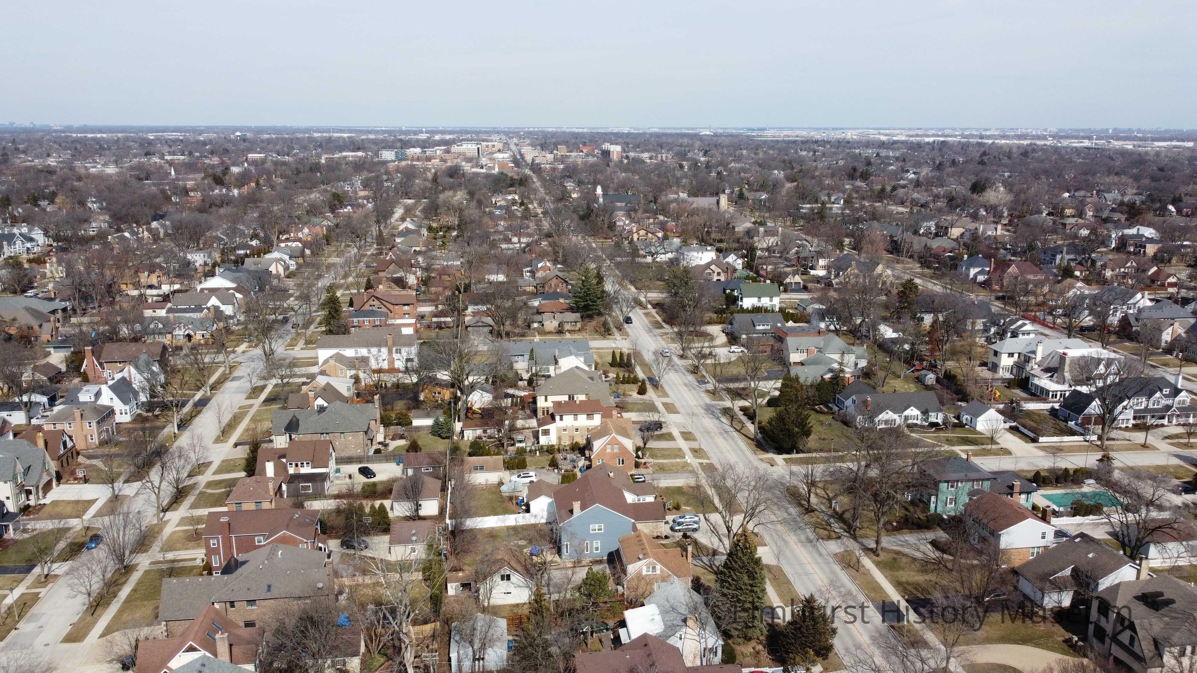 Aerial view of S. York Street, looking north towards the downtown area from the Illinois Prairie Path.Photograph Details