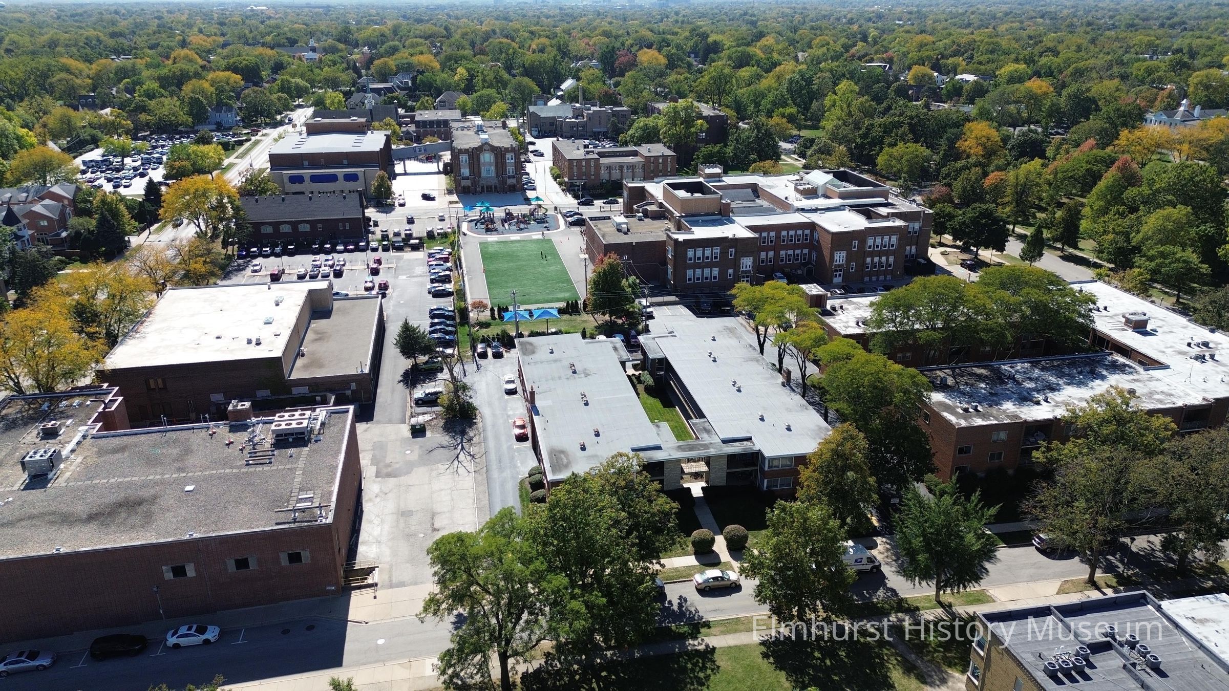 Aerial View of block between S. York Street and Cottage Hill Avenue, looking south from Virginia Street. Hawthorne School is visible at right, and Immaculate Conception Church is in the background.Photograph Details