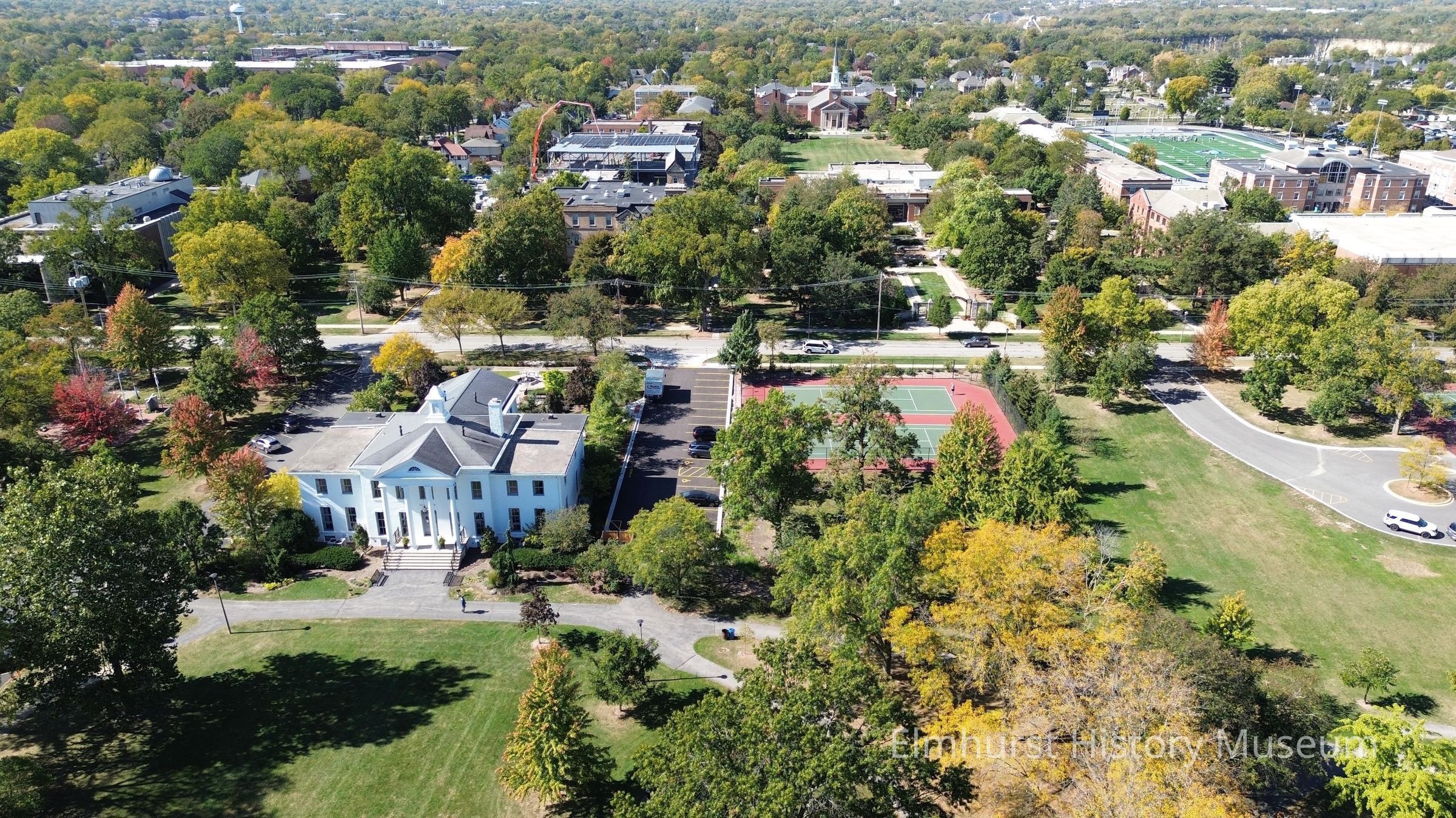 Aerial View of Wilder Park, looking west. The Wilder Mansion is in the foreground, and the Elmhurst University campus can be seen in the background.Photograph Details