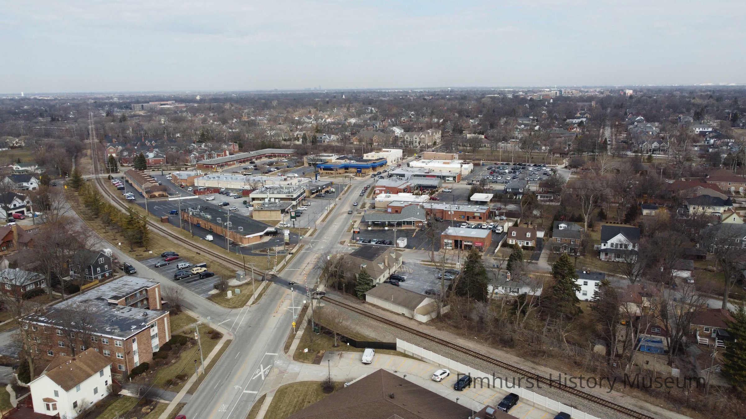 Aerial view of the York and Vallette Business District, looking north past the Illinois Central railroad tracks.Photograph Details