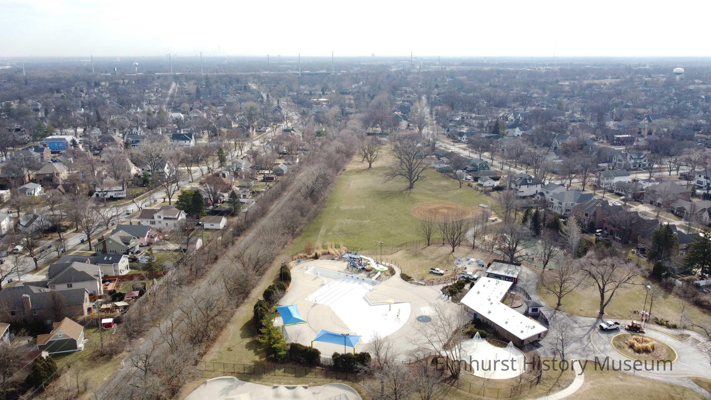 Aerial view of York Commons Park, looking east along the Illinois Central railroad tracks. The Norman Smalley Pool is in the foreground.Photograph Details
