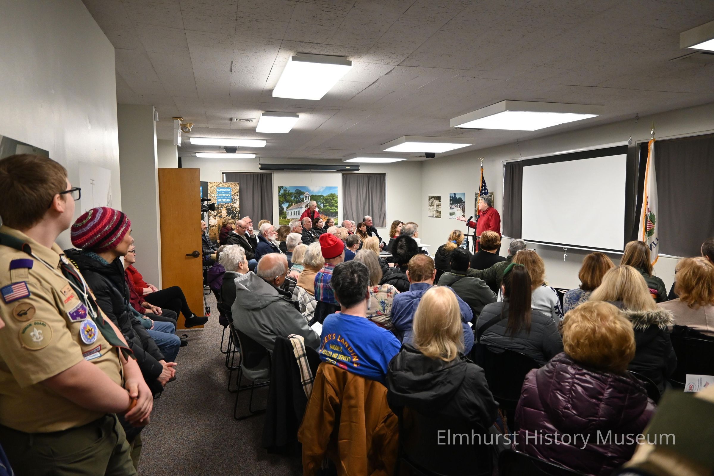 Elmhurst Heritage Foundation president Jean Baker speaks at the flag raising ceremony at the Elmhurst History Museum to commemorate the America 250 celebration.Photograph Details