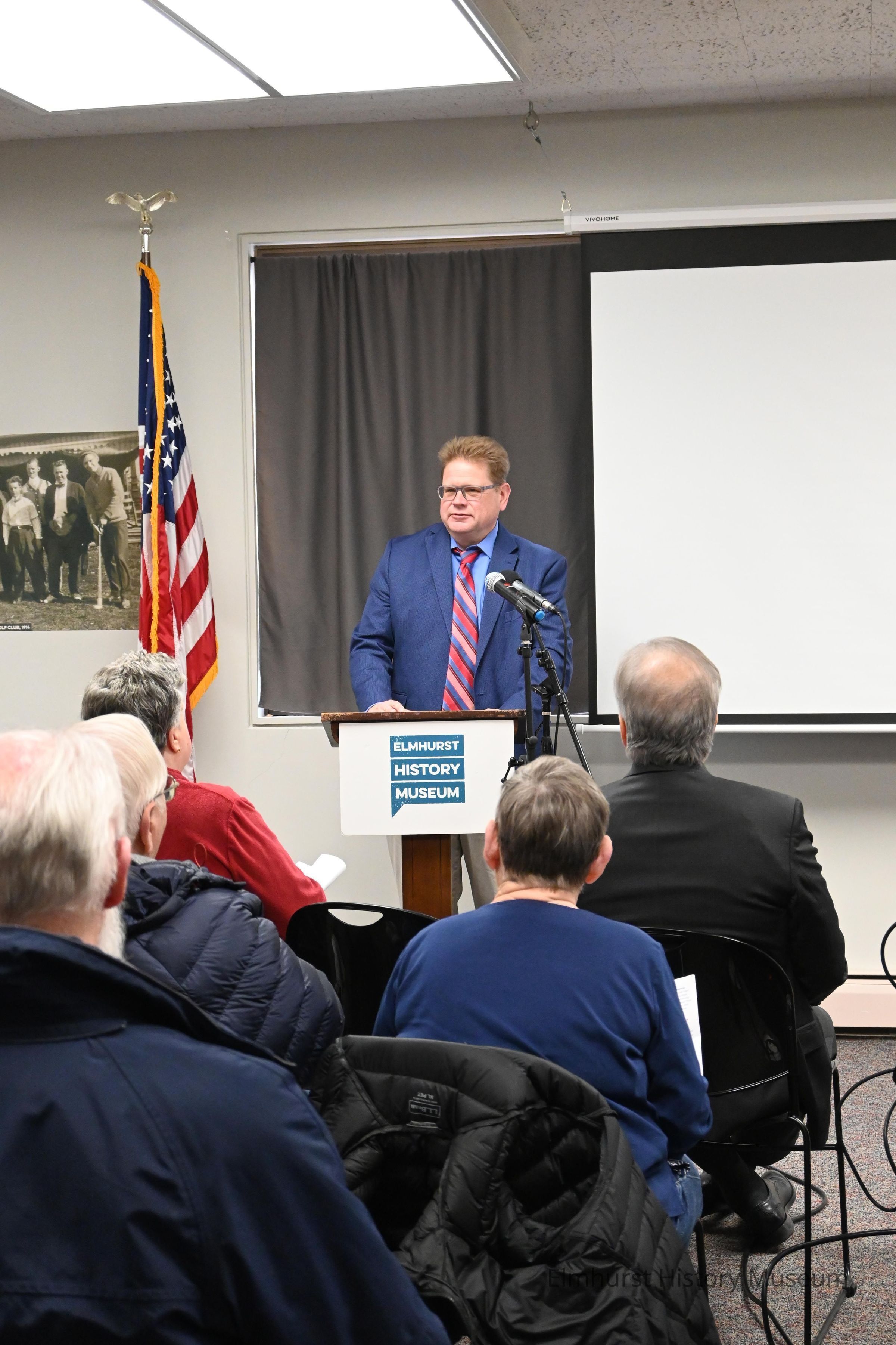 Museum director Dave Oberg speaks at the flag raising ceremony at the Elmhurst History Museum to commemorate the America 250 celebration.Photograph Details