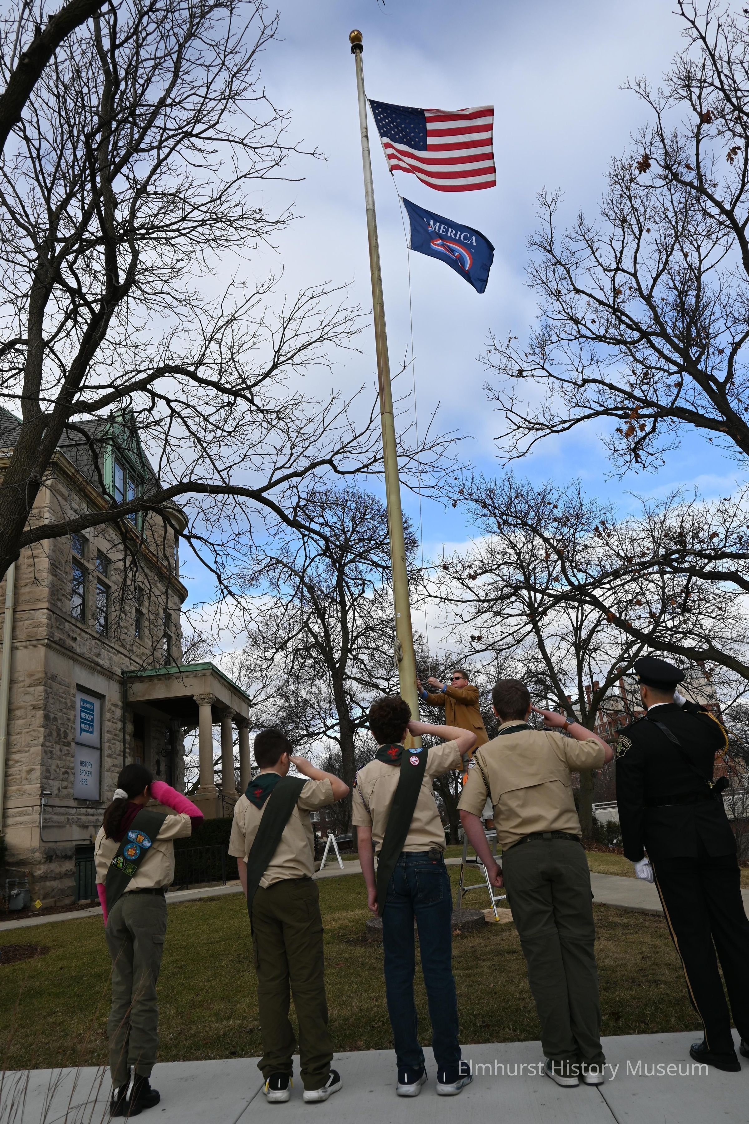 Museum director Dave Oberg raises the semiquincentennial flag at the Elmhurst History Museum to commemorate the America 250 celebration.Photograph Details
