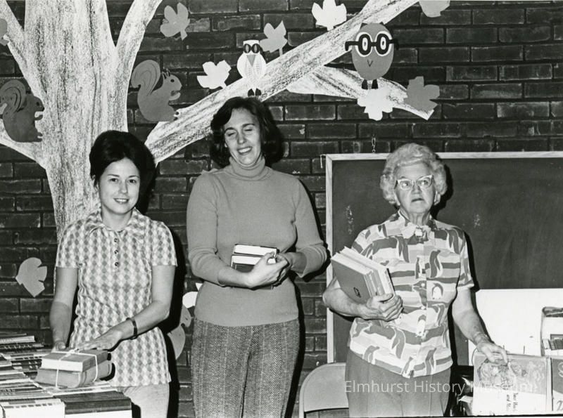 Black and white photograph. Members of the American Association of University Women (AAUW) preparing for a book sale.Photograph Details