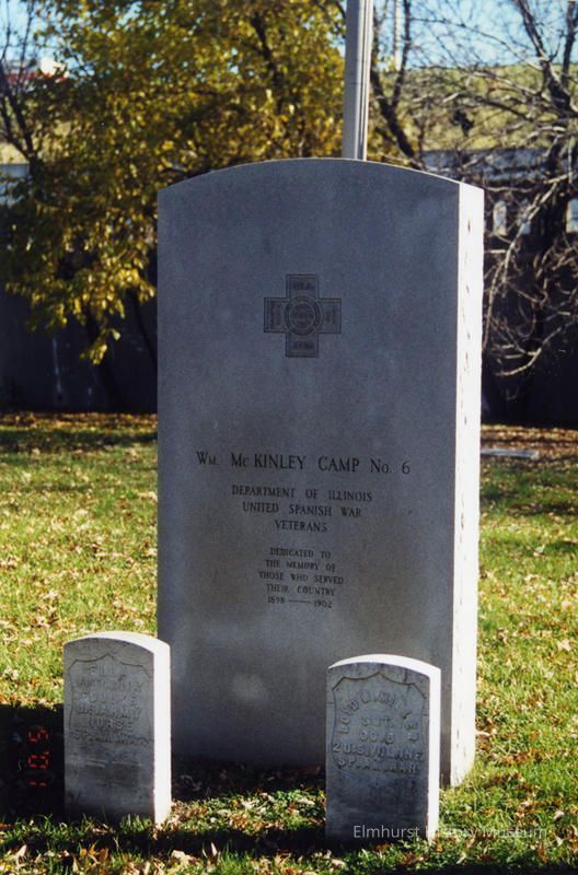 Monument reads: Wm. McKinley Camp No. 6 / Department of Illinois / United Spanish War / Veterans / Dedicated to / the memory of / those who served / their country / 1898-1902