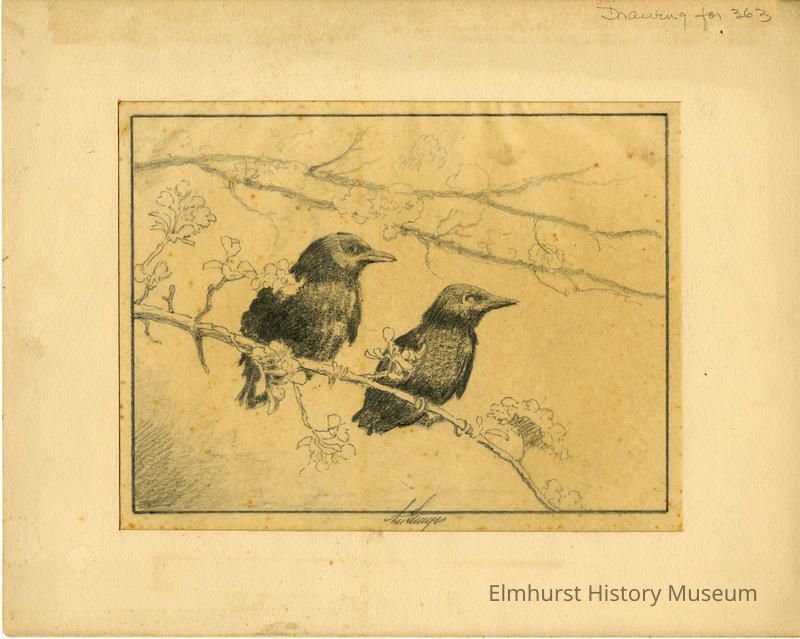 Drawing of two young crows perched on a blossoming branch, mounted on a 2-page mat. Signed and dated. This was the drawing for etching 85.15.260.