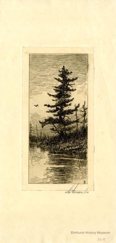 Etching of a large pine tree on the shore of a river. Signed and dated.