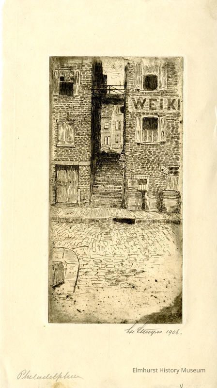 Etching of a street scene looking up a narrow stairway. Signed and dated in front lower left corner. Also, pencilled signature and date in front lower right corner. Lower right corner of mat has letter "V" written in pencil.