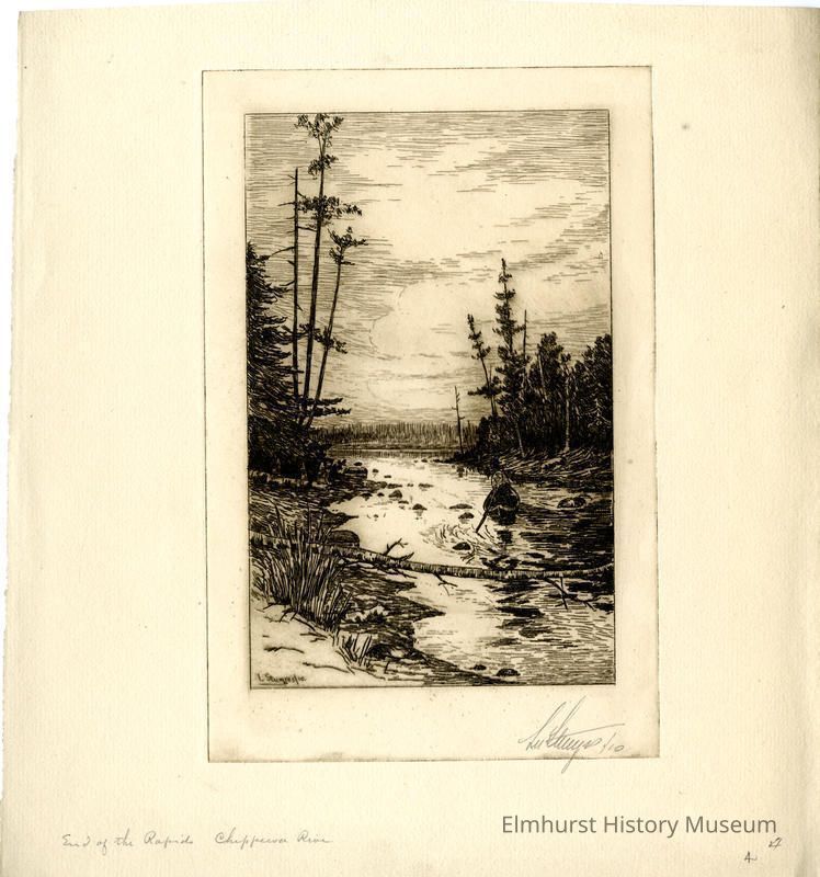 Etching of rapids in a river with a man in a canoe. Signed and dated.