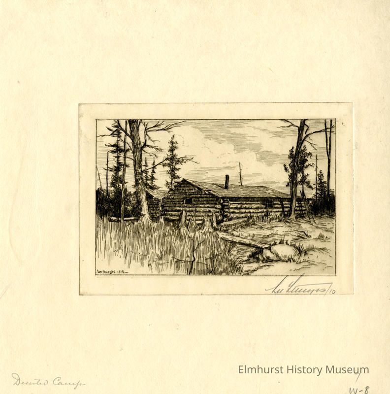 Etching of a log cabin in a clearing in a forest. Signed and dated.