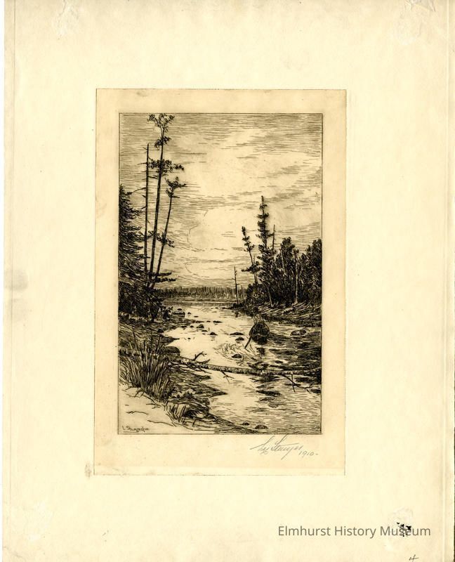 Etching of rapids in a river with a man in a canoe. Signed and dated.