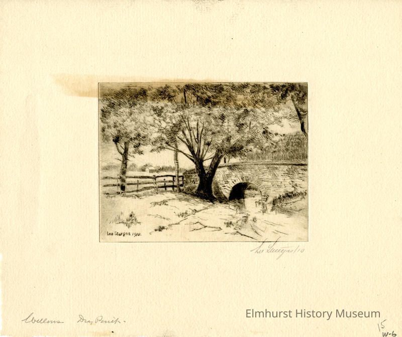 Etching includes a river, bridge, fence and trees. Signed and dated.