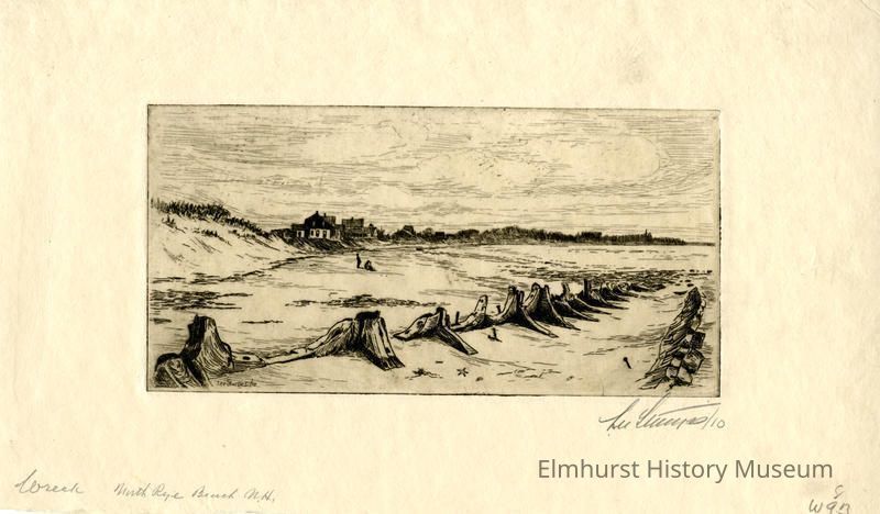 Etching of a beach scene with the remains of a ship. Signed and dated.