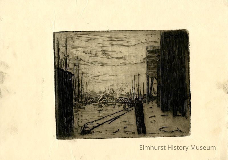 Etching of the Chicago River. Signed and dated (1883) in front upper right corner.