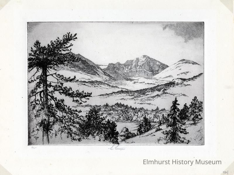 Line etching of a mountain scene with trees in the background. Mounted in a 2-page mat. #9/75. Signed and dated.