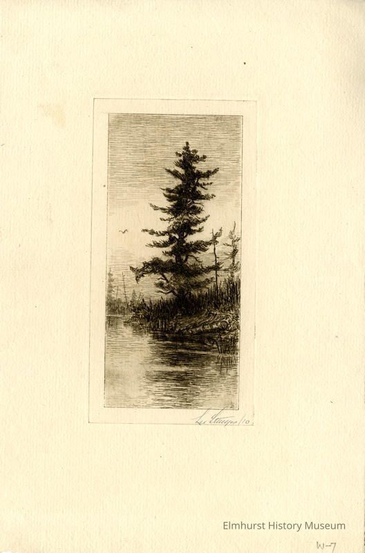 Etching of a large pine tree on the shore of a river. Signed and dated.