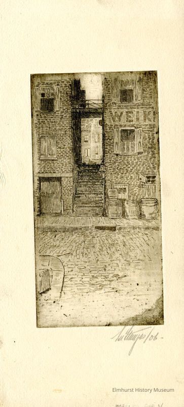 Etching of a street scene looking up a narrow stairway. Signed and dated in front lower left corner. Also, pencilled signature and date in front lower right corner.