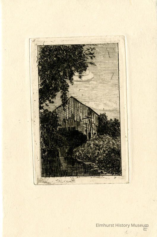 No date. Etching of a barn by a river. "E" in pencil in lower right corner.