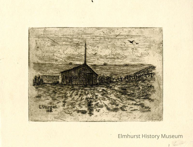 Etching of a building which has the word "Boats" on it. Lower left corner of etching says, "L. Sturges 1881." Lower right corner of mat has letter "J."