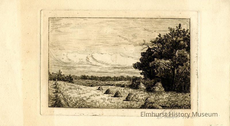 Etching of a hay field with rows of haystacks in it. Signed and dated (1882) in pencil in lower right corner of etching. Lower right corner of mat has the letter "K."