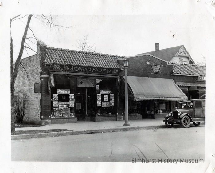 A&P Store at 191 N. York Street. To the right is the Edna May Art and Gift Shop and Belsey's Hardware StorePhotograph Details