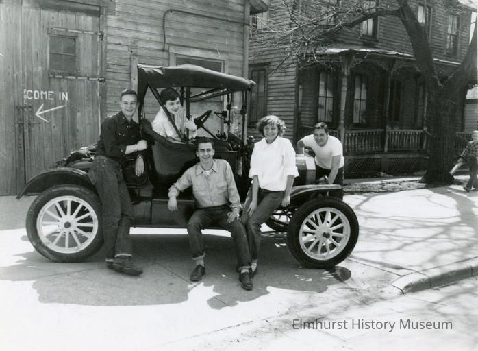 Five youth pose around a vintage car at Charles Johnson Blacksmith Shop on the southeast corner of York Street and Schiller.Photograph Details