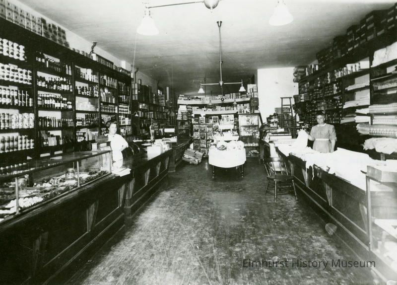 On back: Interior of William Baethke store at NE corner of York + First St. Rt: Hannah Baethke Left: Dorothy Baethke Krause