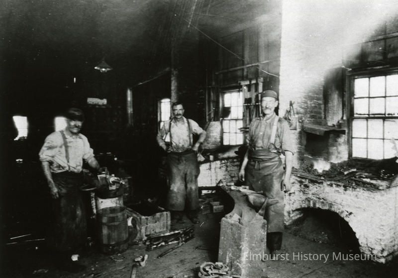Balgemann Blacksmith Shop at 131 S. York. George Balgemann pictured at right.