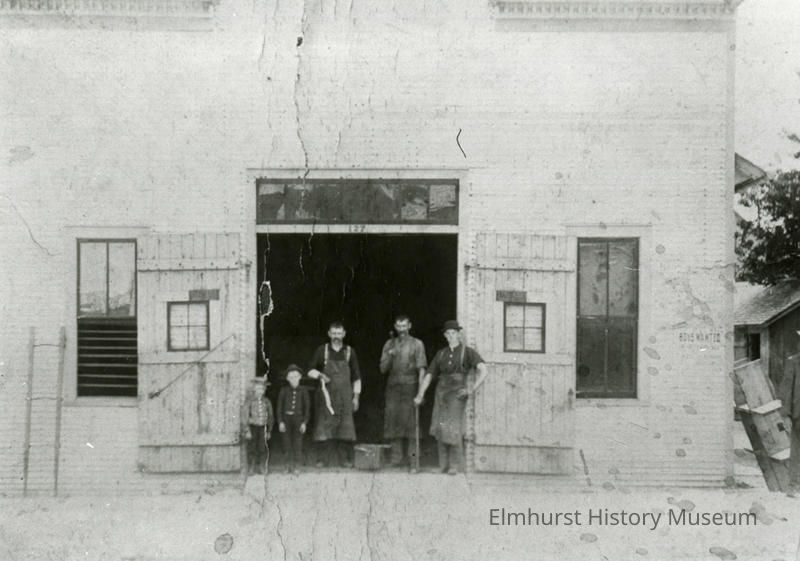 Employees in front of Balgemann Blacksmith Shop at 131 S. York.