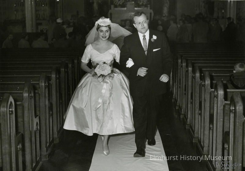 On lower right corner on print side: D. Schecter / CANDID Handwritten in ink on the back: Patricia Ann Harmon / + / James Gleason Bauer / November 29, 1958 / Immaculate Conception Church / Elmhurst, ILL Stamped on the back: 3116 34 / D. Schecter / Photographer / 503 Marshall Ave.-Bellwood, Ill. / PHONE Linden 4-2027