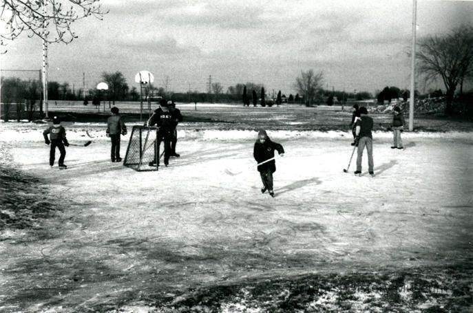 Children playing ice hockey in Berens Park.