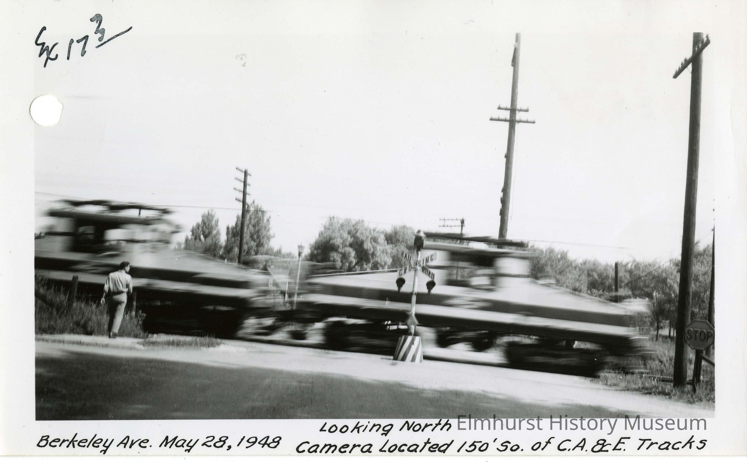View of the Berkeley Avenue railroad crossing, looking north. Photo was taken for the legal case "Illinois Commerce Commission v. Chicago Great Western Railway Company, Chicago Aurora and Elgin Railway Company, and the City of Elmhurst."Photograph Details
