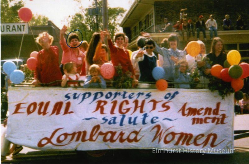 Betsy Aldred (circled) on parade float with a banner reading "Supporters of Equal Rights Amendment Salute Lombard WomenPhotograph Details