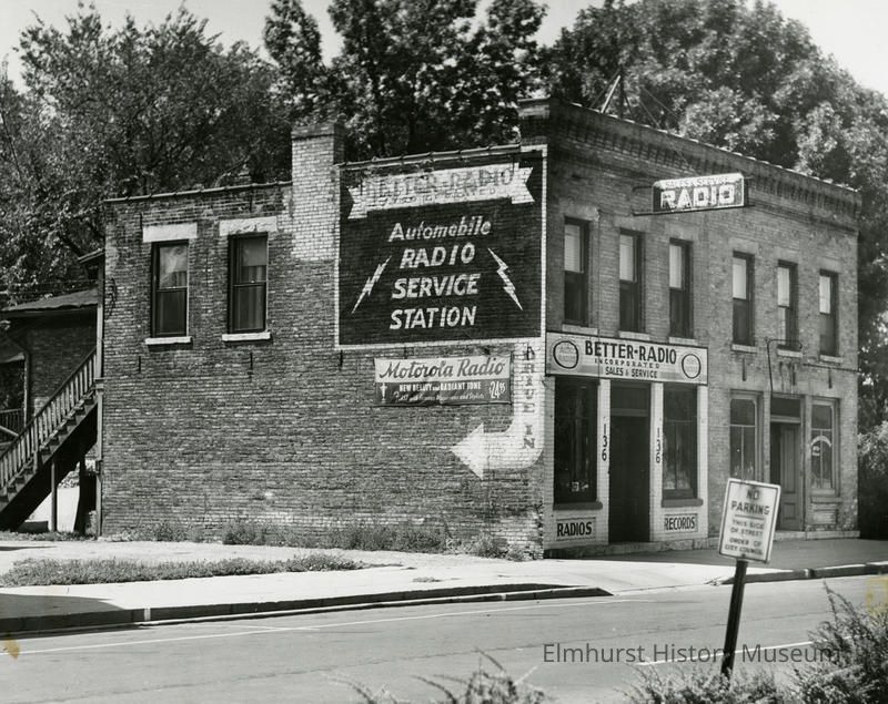 on back: August 1941 136-138 W. Park Photo- L.N. Longwell Oldest Brick Building in Elmhurst Graue Brother ran a dry good store in east half, grocery in west half when I came to Elmhurst 1911 Wm. H. Mardaga (Elmhurst Paint Store) occupied #138 Park Ave from 1923-1932.