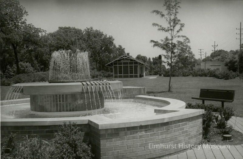 Bicentennial Fountain and Chicago Great Western Railway depot located in Wild Meadows Trace at South and York Streets.Photograph Details