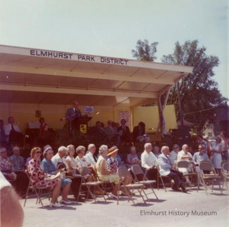 Bicentennial Fountain Dedication at Wild Meadows Trace, with a speaker at the podium and people seated on folding chairs.Photograph Details