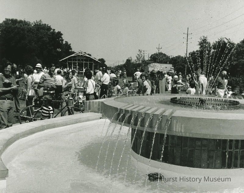 Stamping in blue in lower right corner of the back reads in uppercase letters "Photo by Bob Kross / Elmhurst, Illinois." Handwritten ink identification on the back reads in uppercase letters "Bicentennial Memorial Fountain S. York St at Wild Meadow Trace Elmhurst, IL July 5, 1976."