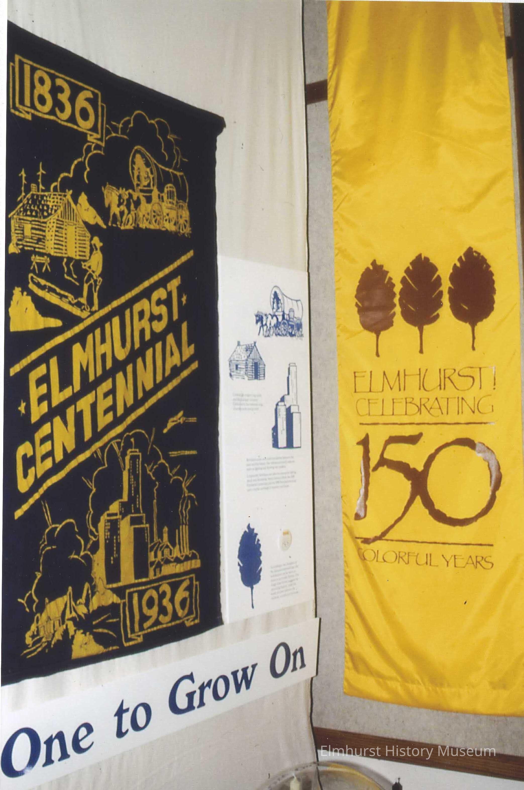 Banners in the Elmhurst Historical Museum's Elmhurst Sesquicentennial exhibit "Birthday Candles and Fireworks."Photograph Details