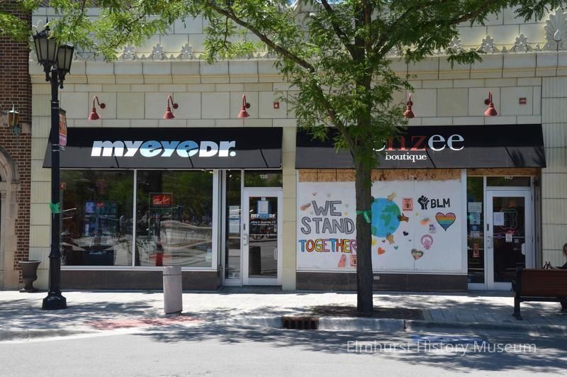 Decorated plywood boards over the windows of enzee boutique at 140 N. York in anticipation of protests related to the killing of George Floyd in Minneapolis and the reaction against police brutality.Photograph Details