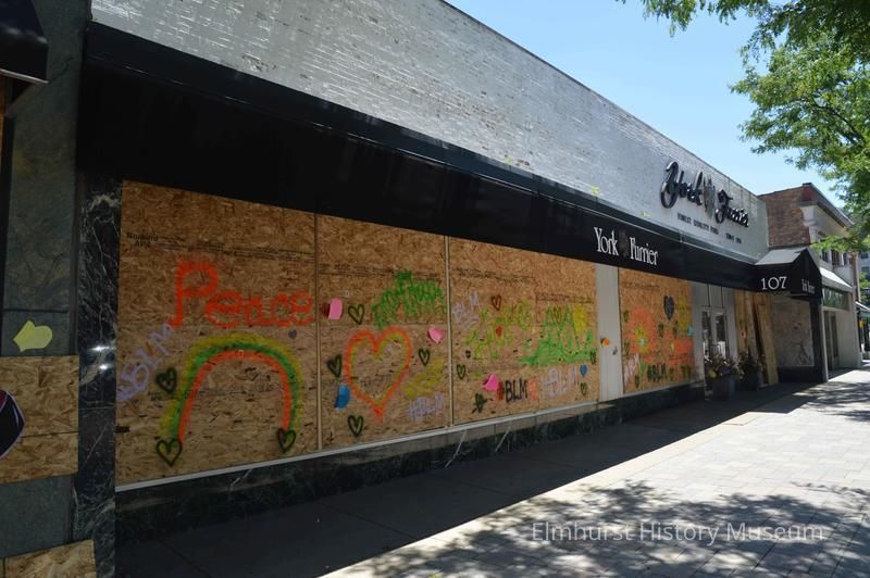Decorated plywood covering the windows of York Furrier at 107 N. York, in anticipation of protests related to the killing of George Floyd in Minneapolis and the reaction against police brutality.Photograph Details