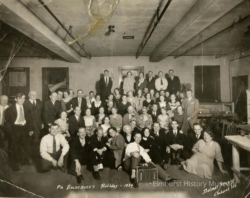 Photograph of "Pa Boldebuck's Birthday." From accession file: Pa and Mrs. Boldebuck are seated in front row on far right. Mr. and Mrs. Herb Boldebuck are seated in the front row 3rd and 4th from the left. Werner Froeming is seated in front row, fourth from right. The photo was taken on the second floor of Elmhurst Laundry, 1934.Photograph Details