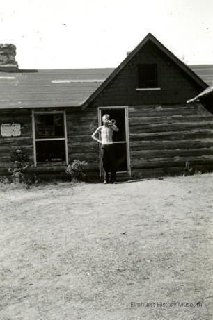 Don Rhimey in front of cabin, Camp Kan-no-see-tuk, Wisconsin