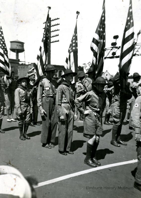Elmhurst Boy Scouts participating in a parade, Walter Larsen, Ed Laudrvert, Larry Prindiville, and unidentifiedPhotograph Details
