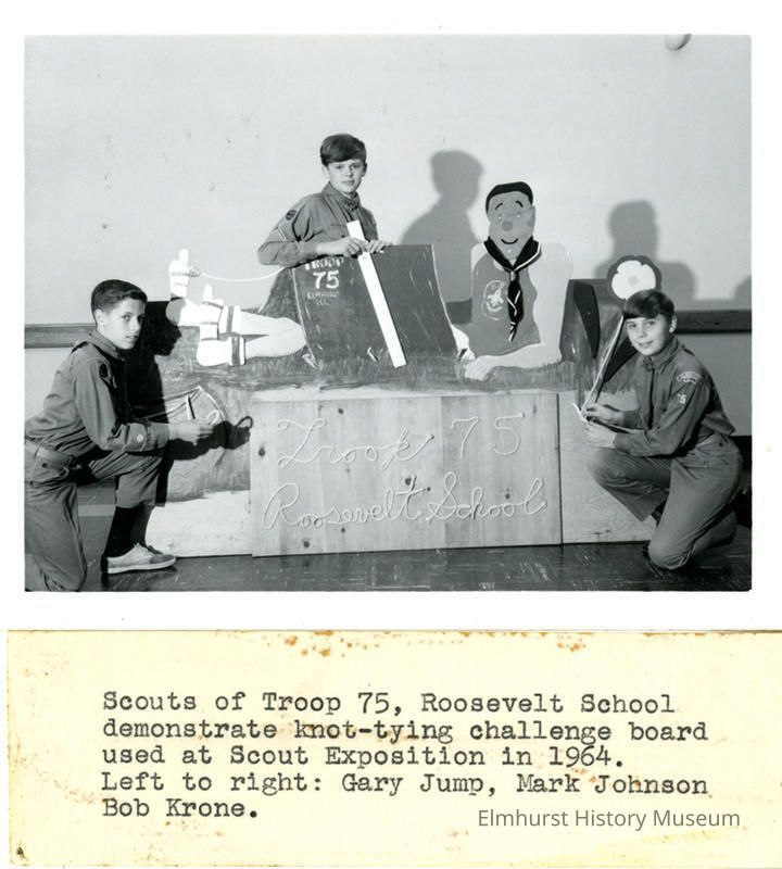 Gary Jump, Mark Johnson, and Bob Krone, of Roosevelt School Boy Scout Troop 75, demonstrating the knot tying challenge board used at the 1964 Scout Exposition.Photograph Details