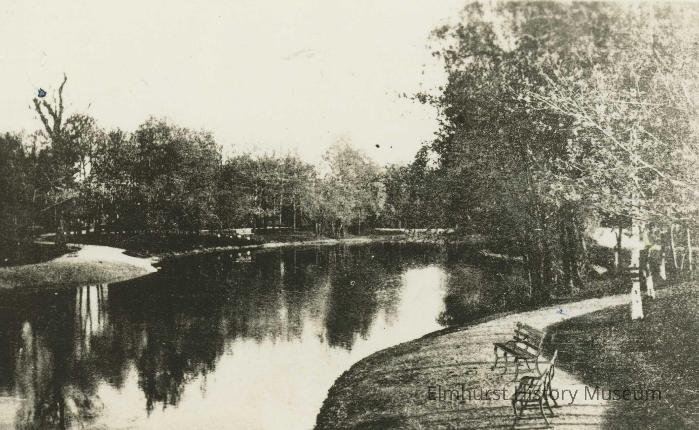 A pond on the Thomas B. Bryan estate, Bird's Nest. The estate was located on the south side of St. Charles Road between York Street and Cottage Hill Avenue, circa 1859-1919.Photograph Details