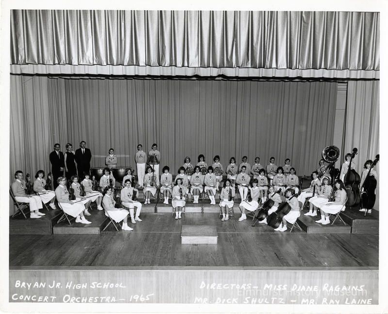 Formal portrait of Bryan Jr. High School Concert Orchestra. Dick Schultz, Diane Ragains, and Ray Laine are listed as directors.Photograph Details